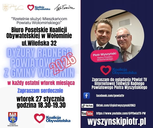 Od stycznia 2026 w Wołominie rozpoczynają się co miesięczne dyżury Radnego Rady Powiatu Wołomińskiego reprezentującego w radzie Gminę Wołomin.